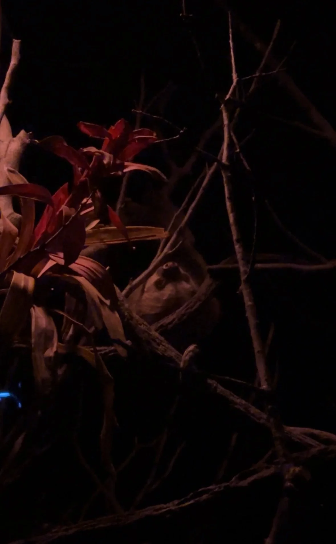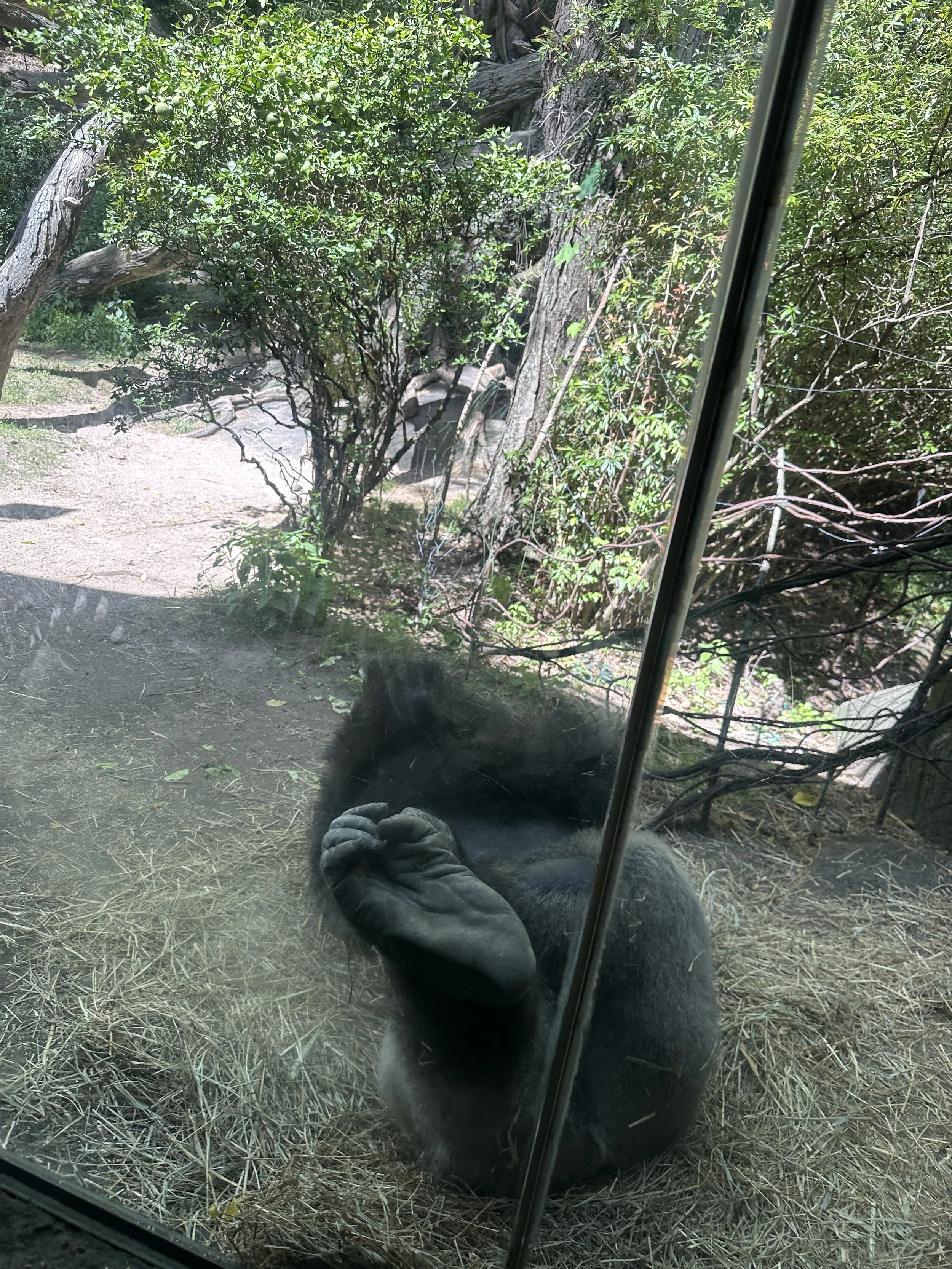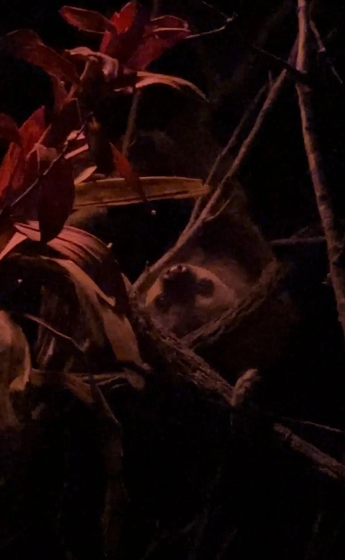 When we finally arrived at the World of Darkness exhibit, it took a few seconds to adapt to the new even hotter climate and the screeching of fruit bats and babies excited to see them. Nocturnal species behind glass observing each other and the stares of visitors. There is an echo in the simulated cave, and though immersive it does make me wonder how comfortable some animals might be. Two sloths live in the middle of the exhibit, and we would have missed them had it not been for a tiny pygmy slow loris that led us to their dark corner in the back. Hanging upside-down off a small angled branch, one sloth inched closer to the glass while eating some leaves. Slowly blinking as it stared in our direction the sloths maneuvered curled branches while aye-aye’s zoomed back and forth and up and down from where the sloths hung. The contrast in speed and excitement like a mockery of their patience. My little fan came in clutch here since there were about two classrooms worth of kids and instructors inside what was meant to feel like a cave.